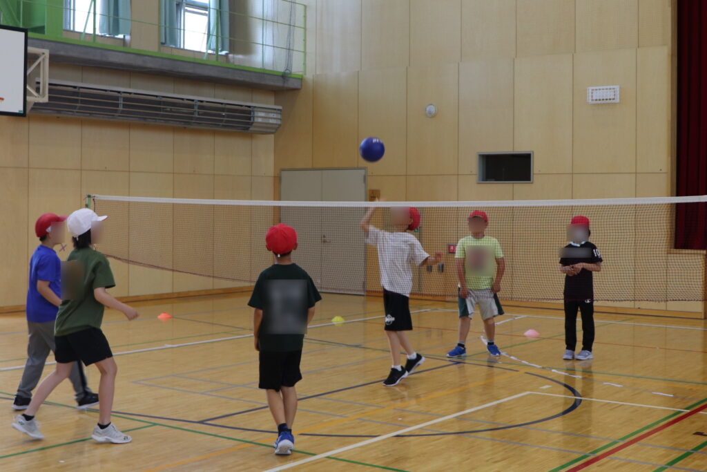 始めは、「投げる」「受け止める」動きを中心に、相手のコートに上手に落とすことができるようチームで取り組みました。