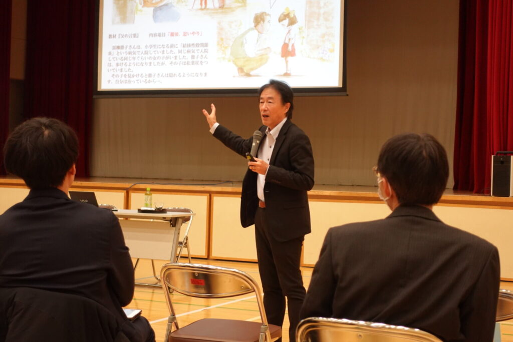 講演では、「モラルは習慣、道徳は実践」という話しを切り口に、多様な他者との“対話”や“議論”を通して、自分なりの『納得解』(=自己決定)探ることこそが道徳授業の基盤であると語られました。続いて、道徳授業においては「スキルは3番目であり、教材分析と対話が最重要である』とし、『教材分析→対話の設計→技法の選択』という授業づくりの基本を徹底する必要性が強調されました。