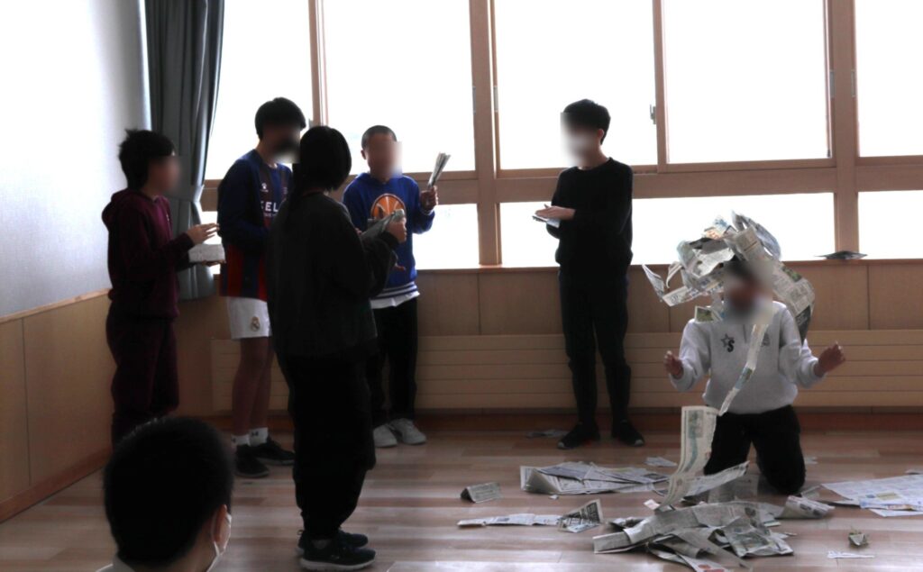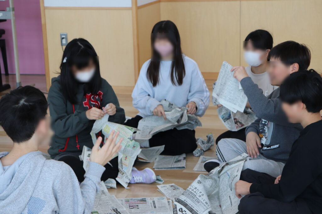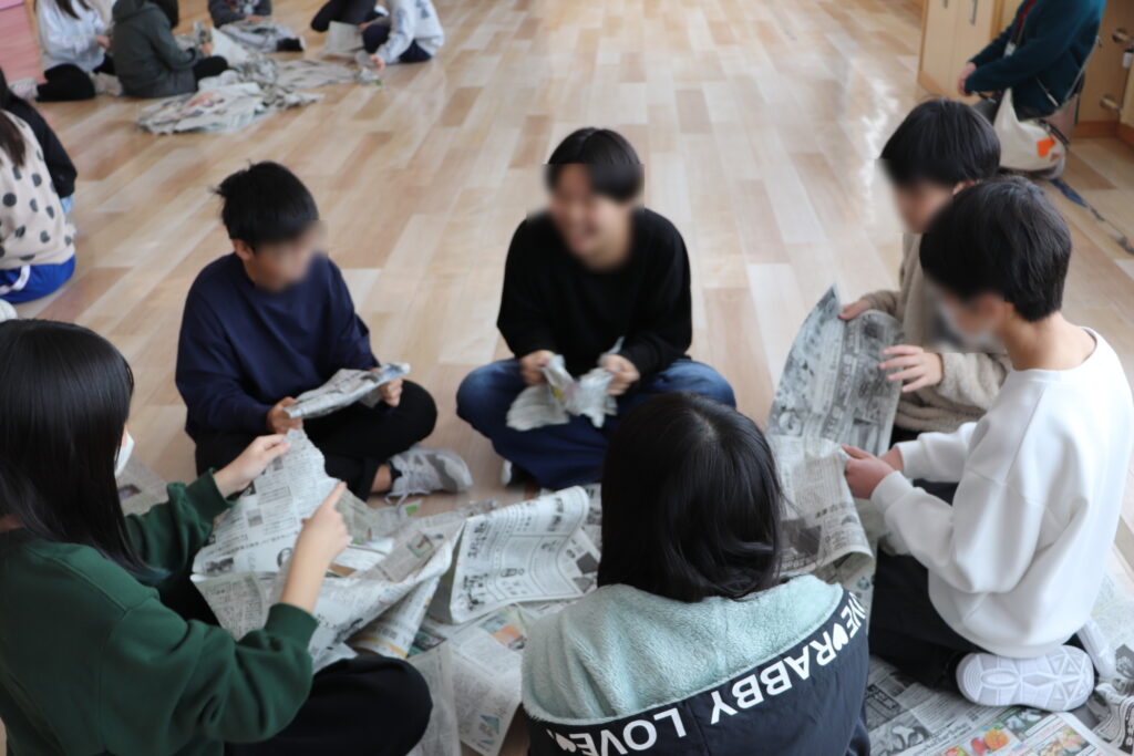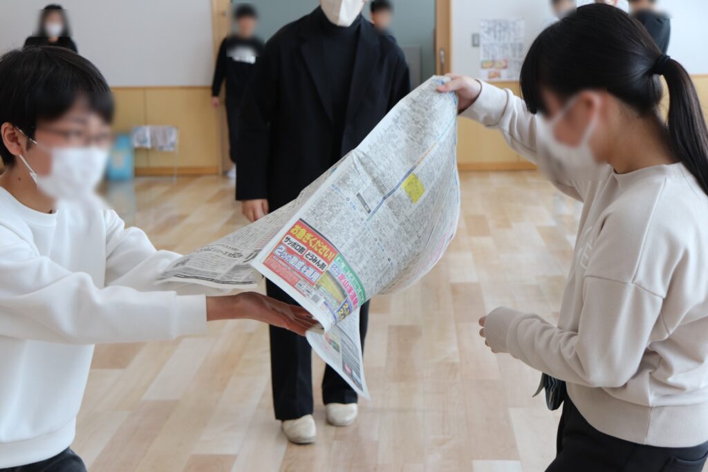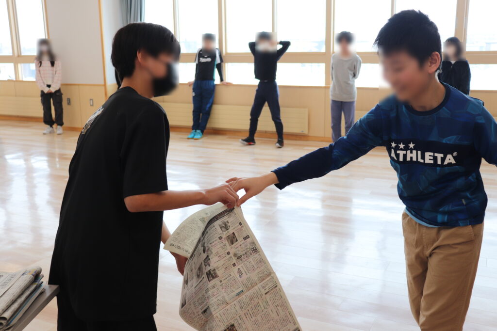 最初にクラス全員で大きな輪になり、広げた1枚の新聞紙を音を立てないように順番に回していきました。