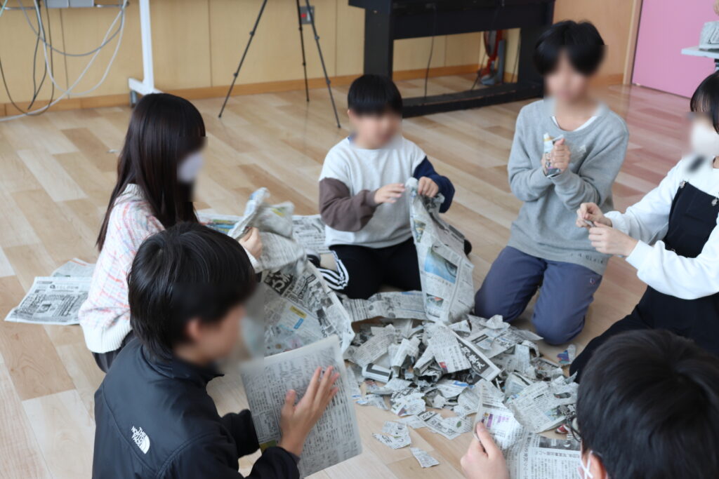 身近にある新聞紙を使って、音楽作りに挑戦した子どもたちはどの子もとても意欲的に活動し、個々の自由な発想を生かし、グループで一つの曲を創り上げるという表現活動を楽しんでいました。